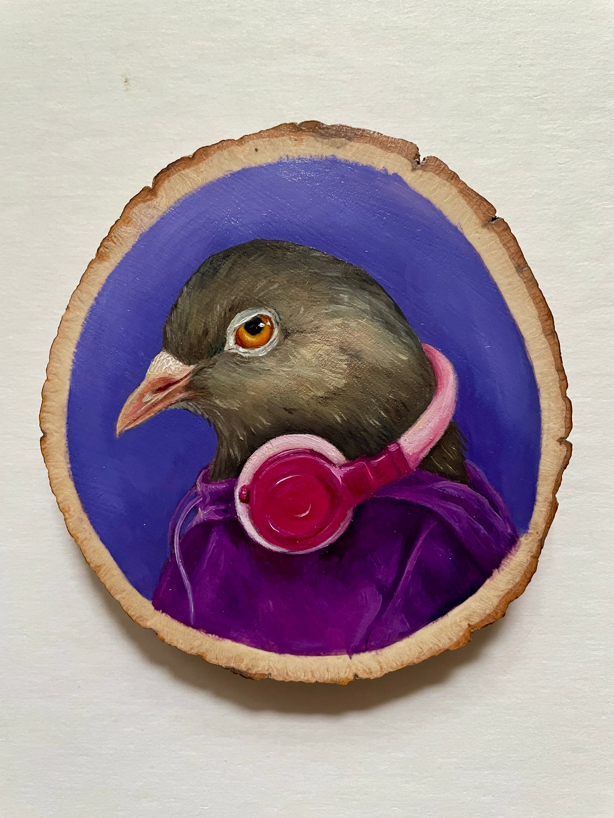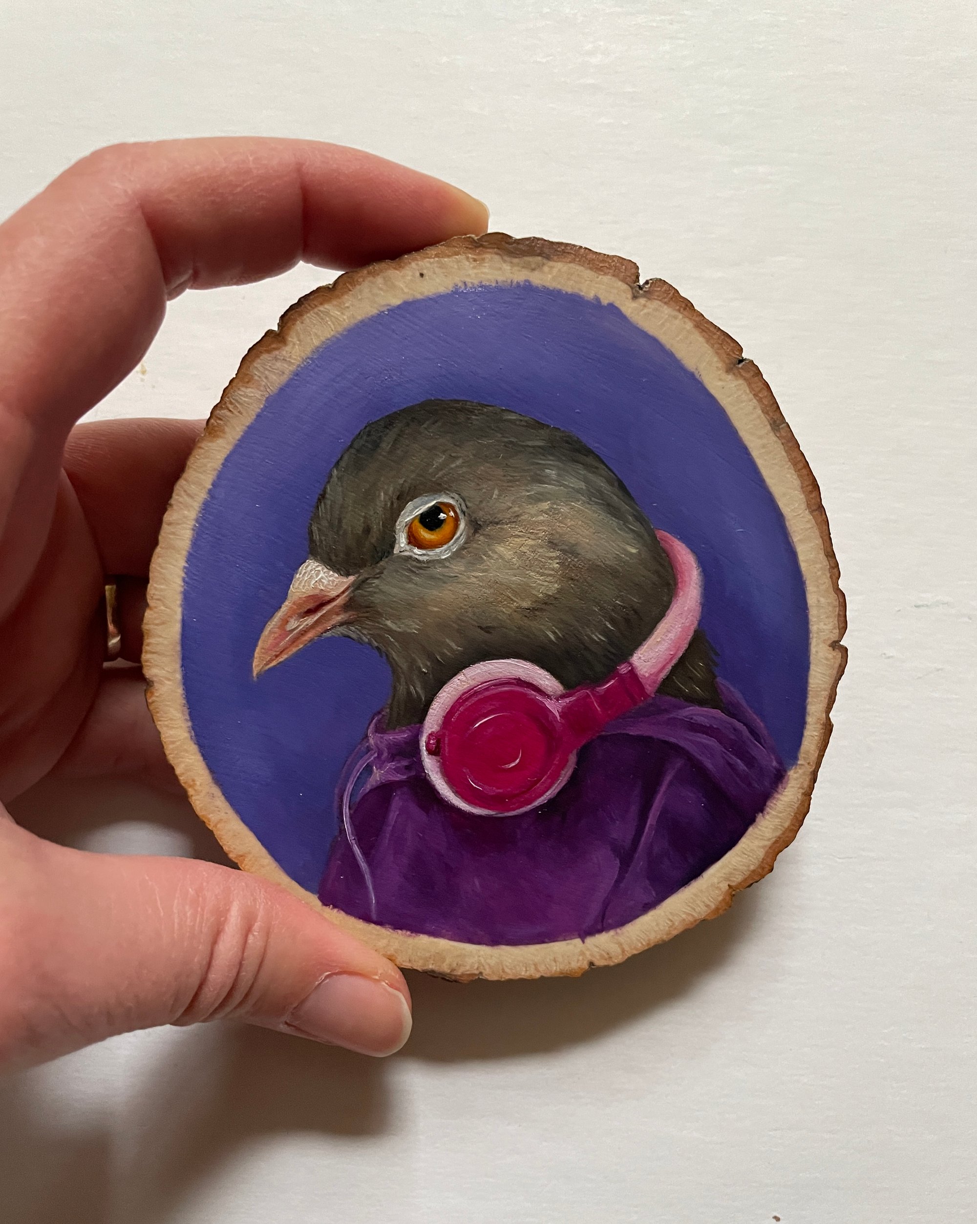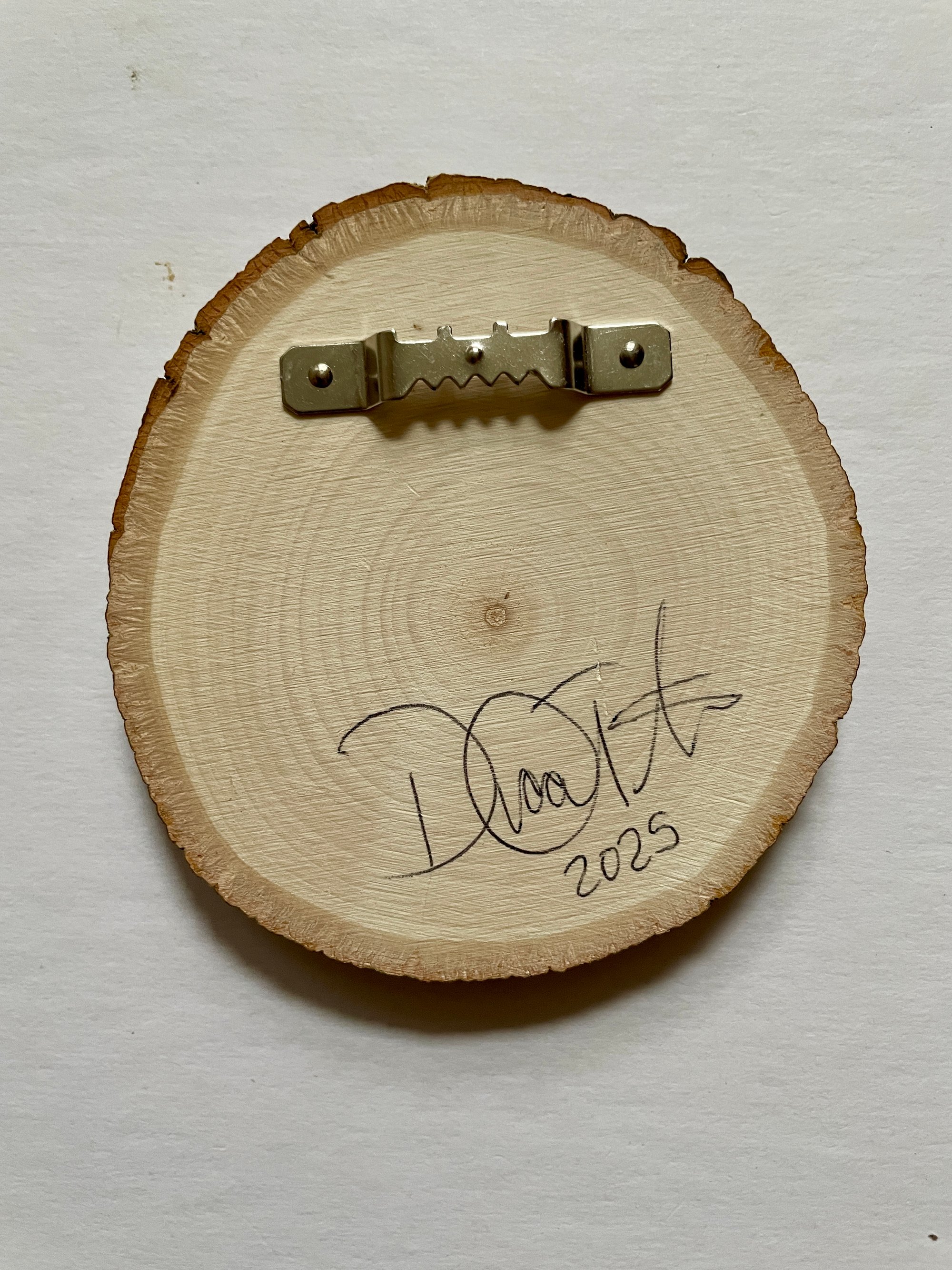 This painting measures about 3.25" high and is hand painted with oils on wood. It is autographed and dated and has a bracket attached making it ready to hang.