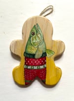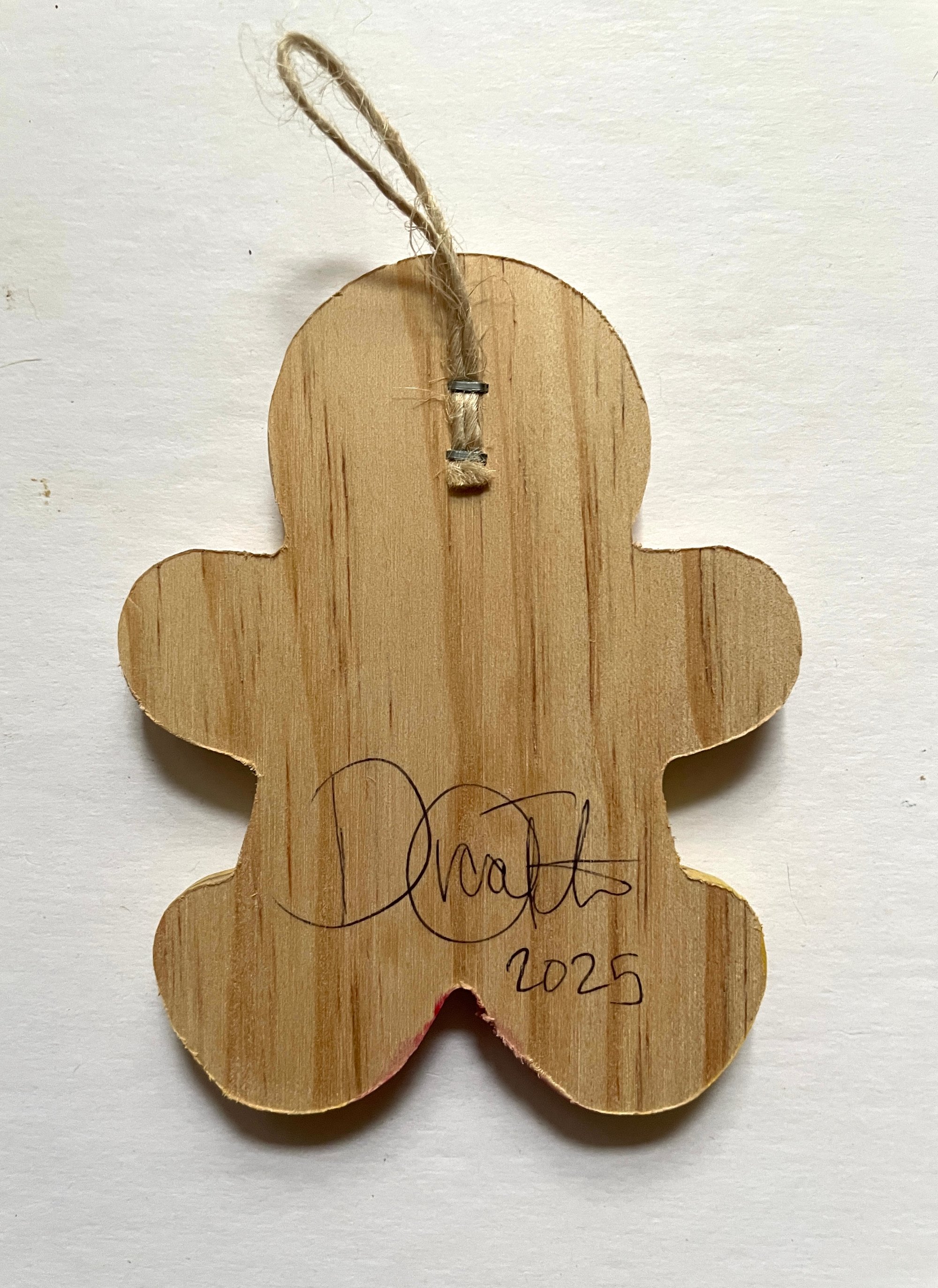 This ornament measures about 4" high and is hand painted with acrylics on wood. It is autographed and dated and has a twine hanger attached.