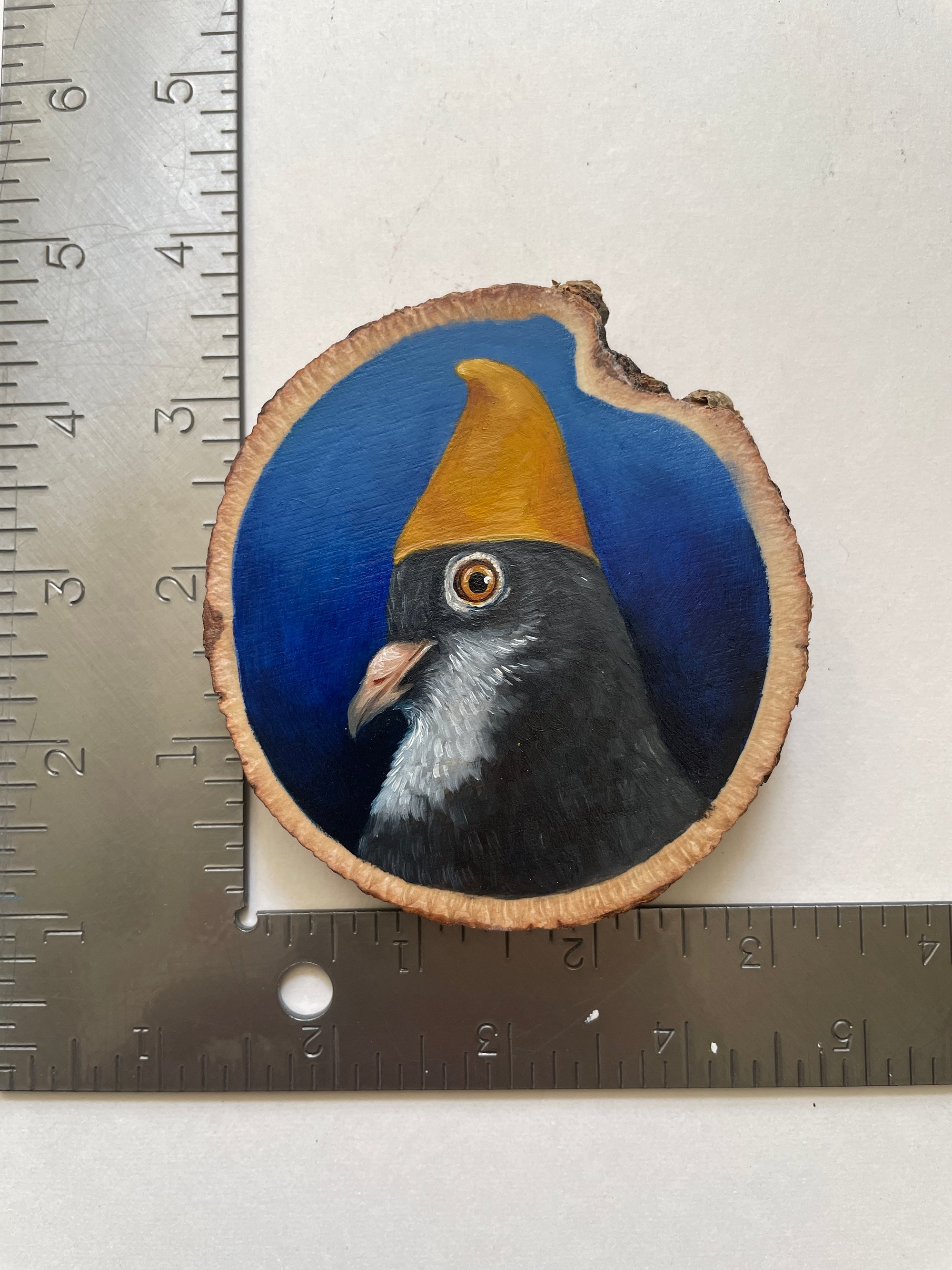 This painting measures about 3.5" high and is hand painted with oils on wood. All my paintings come with metal hardware attached making it ready to hang, it is also autographed and dated.